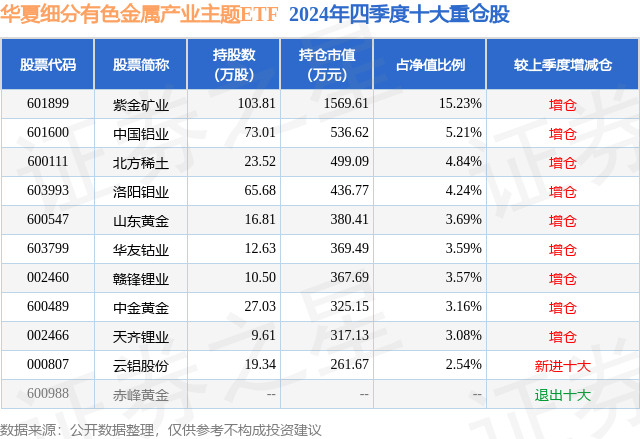 从基金规模来看,华夏细分有色金属产业主题ETF基金2024年四季度公布的基金规模为1.03亿元,较上一期规模1.12亿元变化了-930.87万元,环比变化了-8.29%。该基金最新一期资产配置为:股票占净值比99.52%,无债券类资产,现金占净值比0.56%。从基金持仓来看,该基金当季前十大股票仓位达49.15%,第一大重仓股为紫金矿业(601899),持仓占比为15.23%。