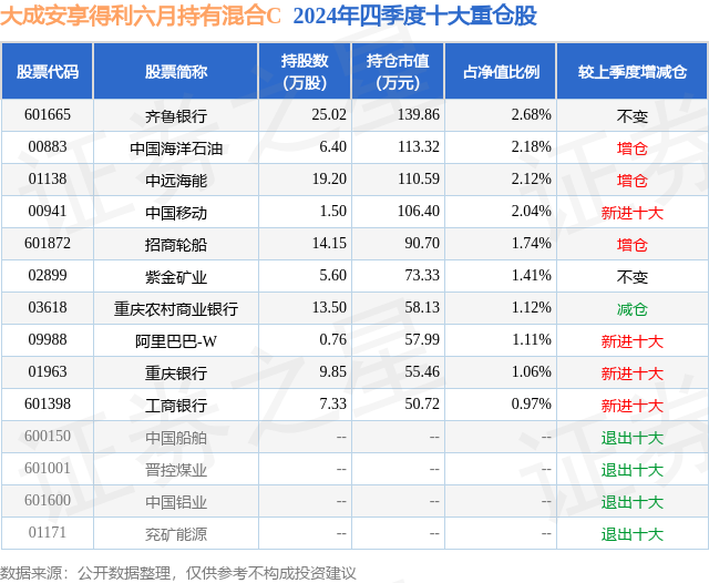 从基金规模来看,大成安享得利六月持有混合C基金2024年四季度公布的基金规模为0.25亿元,较上一期规模2099.48万元变化了440.11万元,环比变化了20.96%。该基金最新一期资产配置为:股票占净值比29.3%,债券占净值比66.29%,现金占净值比5.08%。从基金持仓来看,该基金当季前十大股票仓位达16.43%,第一大重仓股为齐鲁银行(601665),持仓占比为2.68%。