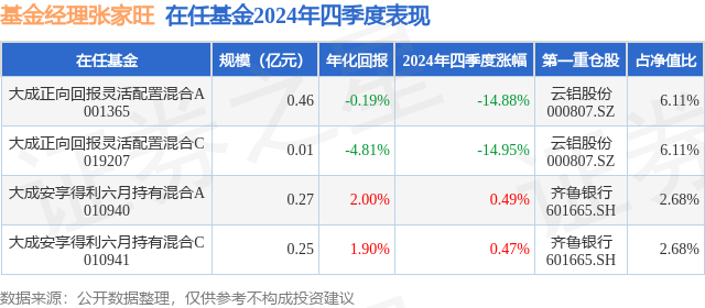 证券之星消息,日前大成安享得利六月持有混合C基金公布四季报,2024年四季度最新规模0.25亿元,季度净值涨幅为0.47%。