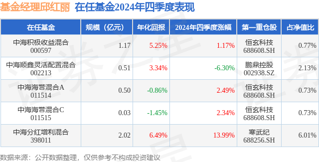 证券之星消息,日前中海海誉混合C基金公布四季报,2024年四季度最新规模0.03亿元,季度净值涨幅为2.34%。