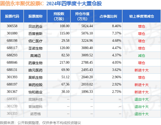 从基金规模来看,圆信永丰聚优股票C基金2024年四季度公布的基金规模为0.34亿元,较上一期规模1787.71万元变化了1606.29万元,环比变化了89.85%。该基金最新一期资产配置为:股票占净值比94.44%,债券占净值比5.12%,现金占净值比1.47%。从基金持仓来看,该基金当季前十大股票仓位达45.65%,第一大重仓股为贝达药业(300558),持仓占比为8.46%。
