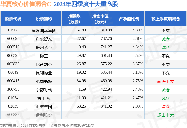 从基金规模来看,华夏核心价值混合C基金2024年四季度公布的基金规模为0.36亿元,较上一期规模4044.7万元变化了-399.11万元,环比变化了-9.87%。该基金最新一期资产配置为:股票占净值比87.89%,无债券类资产,现金占净值比12.2%。从基金持仓来看,该基金当季前十大股票仓位达33.47%,第一大重仓股为建发国际集团(01908),持仓占比为4.8%。