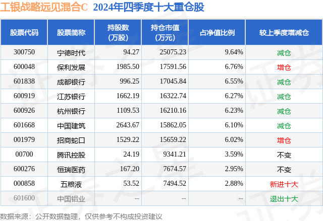 从基金规模来看,工银战略远见混合C基金2024年四季度公布的基金规模为1.93亿元,较上一期规模2.18亿元变化了-2527.96万元,环比变化了-11.61%。该基金最新一期资产配置为:股票占净值比93.82%,无债券类资产,现金占净值比6.43%。从基金持仓来看,该基金当季前十大股票仓位达56.99%,第一大重仓股为宁德时代(300750),持仓占比为9.64%。