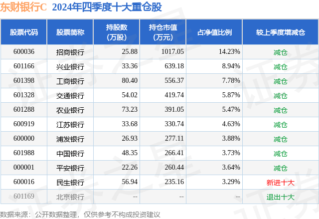 从基金规模来看,东财银行C基金2024年四季度公布的基金规模为0.3亿元,较上一期规模2953.11万元变化了16.6万元,环比变化了0.56%。该基金最新一期资产配置为:股票占净值比94.94%,无债券类资产,现金占净值比7.65%。从基金持仓来看,该基金当季前十大股票仓位达61.46%,第一大重仓股为招商银行(600036),持仓占比为14.23%。