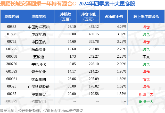 从基金规模来看,景顺长城安泽回报一年持有混合C基金2024年四季度公布的基金规模为0.17亿元,较上一期规模1549.93万元变化了104.74万元,环比变化了6.76%。该基金最新一期资产配置为:股票占净值比39.26%,债券占净值比49.78%,现金占净值比3.66%。从基金持仓来看,该基金当季前十大股票仓位达25.59%,第一大重仓股为中国海洋石油(00883),持仓占比为4.26%。