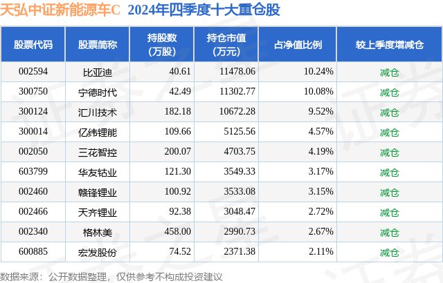 从基金规模来看,天弘中证新能源车C基金2024年四季度公布的基金规模为9.86亿元,较上一期规模11.94亿元变化了-2.09亿元,环比变化了-17.48%。该基金最新一期资产配置为:股票占净值比95.06%,无债券类资产,现金占净值比5.76%。从基金持仓来看,该基金当季前十大股票仓位达52.42%,第一大重仓股为比亚迪(002594),持仓占比为10.24%。