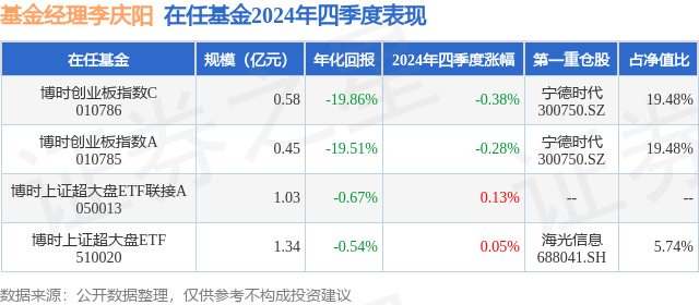 博时创业板指数A现任基金经理为李庆阳。其中在任基金经理李庆阳已从业0年又357天,2024年2月2日正式接手管理博时创业板指数A,任职期间累计回报为32.75%。目前还管理着4只基金产品(包括A类和C类),其中本季度表现最佳的基金为博时上证超大盘ETF联接A(050013),季度净值涨幅为0.13%。