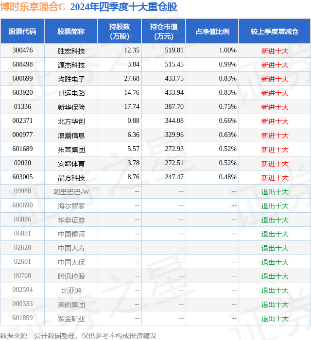 从基金规模来看,博时乐享混合C基金2024年四季度公布的基金规模为0.21亿元,较上一期规模2342.33万元变化了-217.12万元,环比变化了-9.27%。该基金最新一期资产配置为:股票占净值比15.68%,债券占净值比68.17%,现金占净值比5.36%。从基金持仓来看,该基金当季前十大股票仓位达7.21%,第一大重仓股为胜宏科技(300476),持仓占比为1.0%。