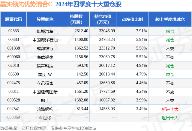 证券之星消息,日前嘉实领先优势混合C基金公布四季报,2024年四季度最新规模1.18亿元,季度净值涨幅为-2.82%。