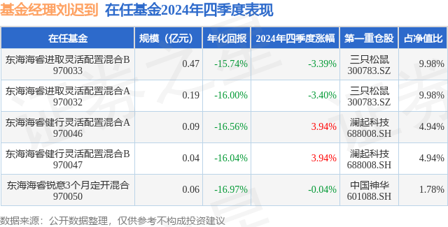 东海海睿进取灵活配置混合B现任基金经理为刘迟到。其中在任基金经理刘迟到已从业2年又141天,2022年9月6日正式接手管理东海海睿进取灵活配置混合B,任职期间累计回报为-28.92%。目前还管理着5只基金产品(包括A类和C类),其中本季度表现最佳的基金为东海海睿健行灵活配置混合A(970046),季度净值涨幅为3.94%。