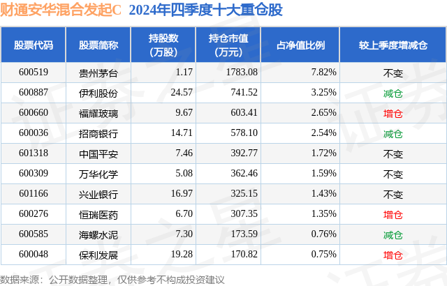 从基金规模来看,财通安华混合发起C基金2024年四季度公布的基金规模为1.78亿元,较上一期规模1.78亿元变化了-2.07万元,环比变化了-0.01%。该基金最新一期资产配置为:股票占净值比30.63%,债券占净值比47.9%,现金占净值比4.96%。从基金持仓来看,该基金当季前十大股票仓位达23.86%,第一大重仓股为贵州茅台(600519),持仓占比为7.82%。