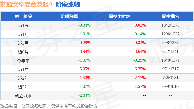 从业绩表现来看,财通安华混合发起A基金过去一年净值涨幅为5.05%,在同类基金中排名971/1317,同类基金过去一年净值涨幅中位数为6.75%。而基金过去一年的最大回撤为-3.87%,成立以来的最大回撤为-9.99%。