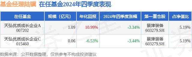 证券之星消息,日前天弘优质成长企业A基金公布四季报,2024年四季度最新规模1.09亿元,季度净值涨幅为-3.34%。