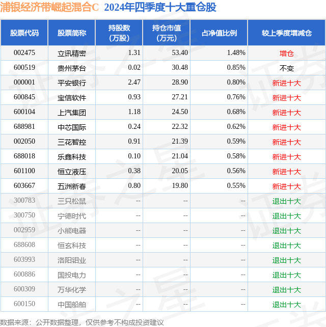 从基金规模来看,浦银经济带崛起混合C基金2024年四季度公布的基金规模为0.07亿元,较上一期规模703.88万元变化了-45.33万元,环比变化了-6.44%。该基金最新一期资产配置为:股票占净值比23.23%,债券占净值比38.68%,现金占净值比4.6%。从基金持仓来看,该基金当季前十大股票仓位达7.47%,第一大重仓股为立讯精密(002475),持仓占比为1.48%。