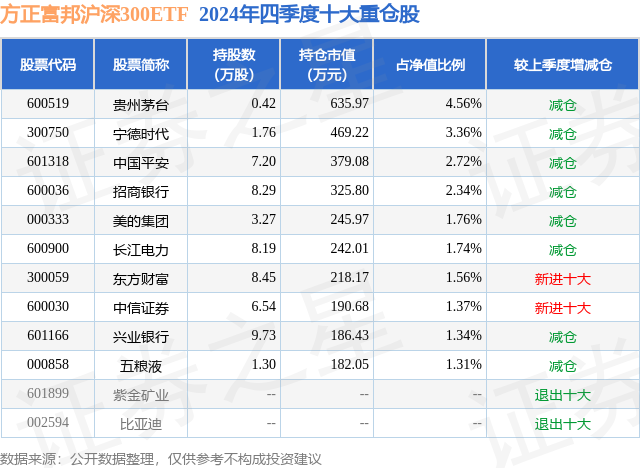 从基金规模来看,方正富邦沪深300ETF基金2024年四季度公布的基金规模为1.39亿元,较上一期规模1.47亿元变化了-801.09万元,环比变化了-5.43%。该基金最新一期资产配置为:股票占净值比98.8%,无债券类资产,现金占净值比1.42%。从基金持仓来看,该基金当季前十大股票仓位达22.06%,第一大重仓股为贵州茅台(600519),持仓占比为4.56%。