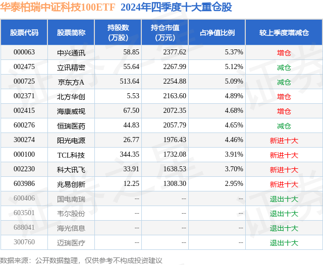 从基金规模来看,华泰柏瑞中证科技100ETF基金2024年四季度公布的基金规模为4.43亿元,较上一期规模4.91亿元变化了-4859.73万元,环比变化了-9.89%。该基金最新一期资产配置为:股票占净值比98.56%,无债券类资产,现金占净值比1.53%。从基金持仓来看,该基金当季前十大股票仓位达44.82%,第一大重仓股为中兴通讯(000063),持仓占比为5.37%。