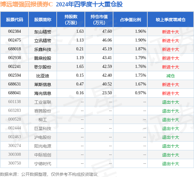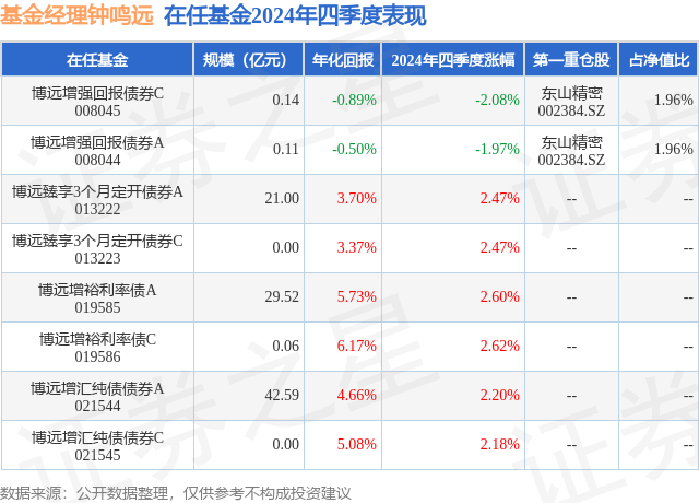 证券之星消息,日前博远增强回报债券C基金公布四季报,2024年四季度最新规模0.14亿元,季度净值涨幅为-2.08%。