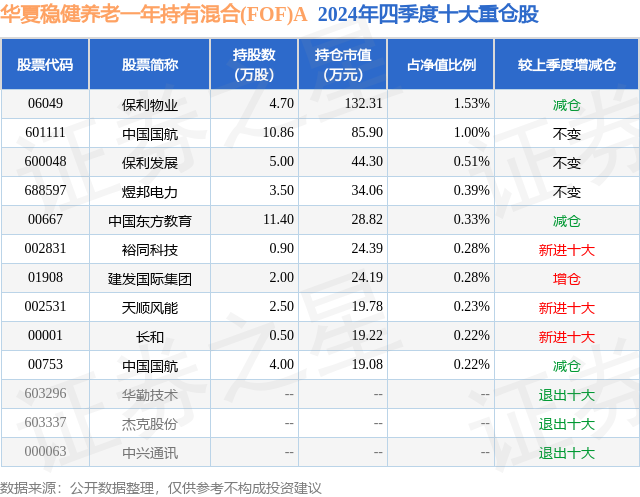 从基金规模来看,华夏稳健养老一年持有混合(FOF)A基金2024年四季度公布的基金规模为0.8亿元,较上一期规模1.15亿元变化了-3529.39万元,环比变化了-30.74%。该基金最新一期资产配置为:股票占净值比6.65%,债券占净值比4.72%,现金占净值比1.64%。从基金持仓来看,该基金当季前十大股票仓位达4.99%,第一大重仓股为保利物业(06049),持仓占比为1.53%。