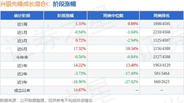 从业绩表现来看,兴银先锋成长混合C基金过去一年净值涨幅为14.22%,在同类基金中排名1963/4129,同类基金过去一年净值涨幅中位数为13.48%。而基金过去一年的最大回撤为-16.16%,成立以来的最大回撤为-40.38%。