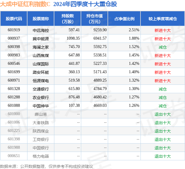 从基金规模来看,大成中证红利指数C基金2024年四季度公布的基金规模为9.02亿元,较上一期规模15.03亿元变化了-6.0亿元,环比变化了-39.95%。该基金最新一期资产配置为:股票占净值比94.4%,无债券类资产,现金占净值比5.61%。从基金持仓来看,该基金当季前十大股票仓位达15.33%,第一大重仓股为中远海控(601919),持仓占比为2.51%。