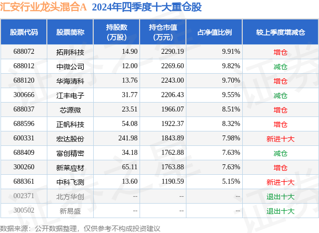 从基金规模来看,汇安行业龙头混合A基金2024年四季度公布的基金规模为2.28亿元,较上一期规模2.28亿元变化了38.55万元,环比变化了0.17%。该基金最新一期资产配置为:股票占净值比94.63%,无债券类资产,现金占净值比5.89%。从基金持仓来看,该基金当季前十大股票仓位达84.2%,第一大重仓股为拓荆科技(688072),持仓占比为9.91%。