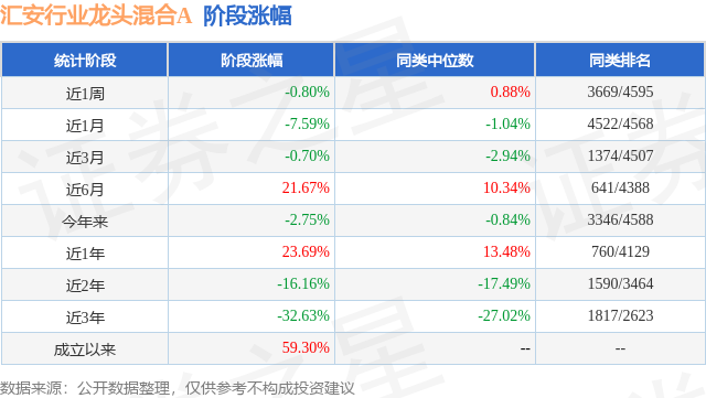 从业绩表现来看,汇安行业龙头混合A基金过去一年净值涨幅为23.69%,在同类基金中排名760/4129,同类基金过去一年净值涨幅中位数为13.48%。而基金过去一年的最大回撤为-25.51%,成立以来的最大回撤为-62.4%。