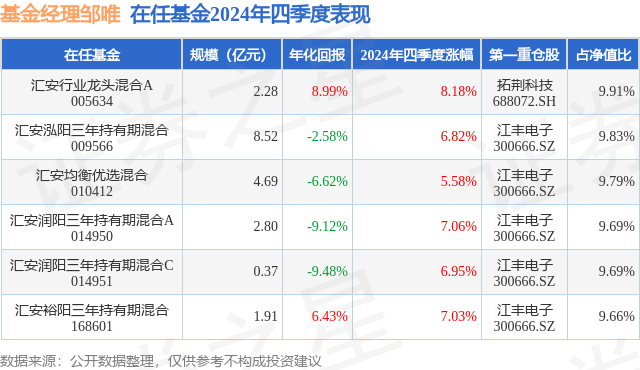 证券之星消息,日前汇安行业龙头混合A基金公布四季报,2024年四季度最新规模2.28亿元,季度净值涨幅为8.18%。