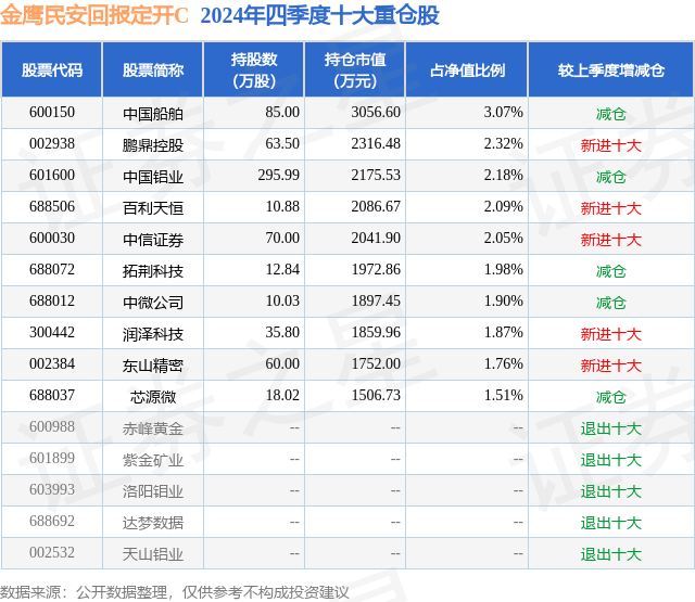 从基金规模来看,金鹰民安回报定开C基金2024年四季度公布的基金规模为0.79亿元,较上一期规模1.11亿元变化了-3261.12万元,环比变化了-29.31%。该基金最新一期资产配置为:股票占净值比39.09%,债券占净值比95.44%,现金占净值比3.03%。从基金持仓来看,该基金当季前十大股票仓位达20.73%,第一大重仓股为中国船舶(600150),持仓占比为3.07%。