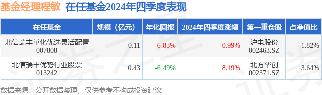 证券之星消息,日前北信瑞丰量化优选灵活配置基金公布四季报,2024年四季度最新规模0.11亿元,季度净值涨幅为0.99%。