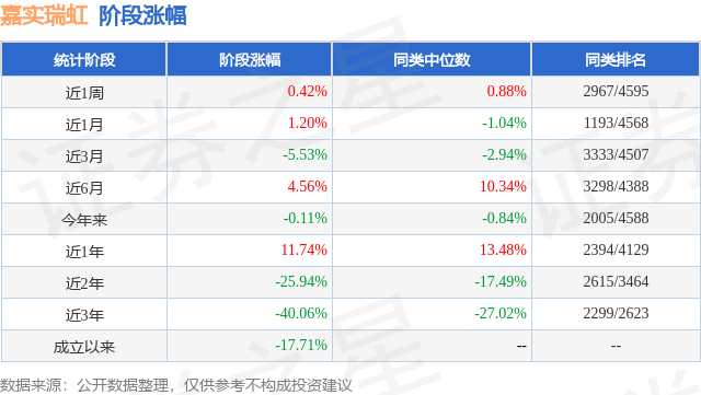 从业绩表现来看,嘉实瑞虹基金过去一年净值涨幅为11.74%,在同类基金中排名2394/4129,同类基金过去一年净值涨幅中位数为13.48%。而基金过去一年的最大回撤为-17.12%,成立以来的最大回撤为-62.5%。