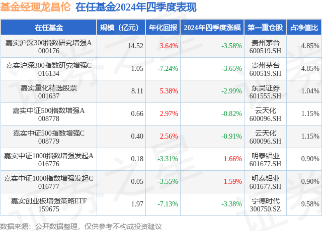 嘉实中证500指数增强A现任基金经理为龙昌伦。其中在任基金经理龙昌伦已从业7年又218天,2020年1月20日正式接手管理嘉实中证500指数增强A,任职期间累计回报为15.91%。目前还管理着8只基金产品(包括A类和C类),其中本季度表现最佳的基金为嘉实中证1000指数增强发起A(016776),季度净值涨幅为1.66%。