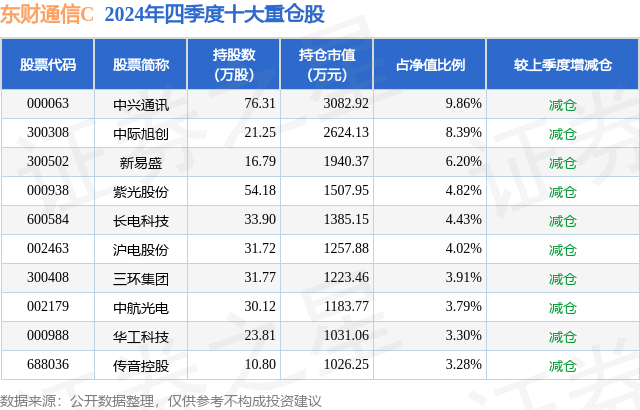 从基金规模来看,东财通信C基金2024年四季度公布的基金规模为2.25亿元,较上一期规模2.4亿元变化了-1585.54万元,环比变化了-6.6%。该基金最新一期资产配置为:股票占净值比94.77%,无债券类资产,现金占净值比6.21%。从基金持仓来看,该基金当季前十大股票仓位达52.0%,第一大重仓股为中兴通讯(000063),持仓占比为9.86%。