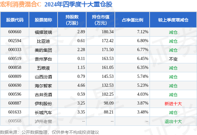 从基金规模来看,宏利消费混合C基金2024年四季度公布的基金规模为0.06亿元,较上一期规模747.39万元变化了-135.75万元,环比变化了-18.16%。该基金最新一期资产配置为:股票占净值比93.89%,债券占净值比5.57%,现金占净值比1.65%。从基金持仓来看,该基金当季前十大股票仓位达55.84%,第一大重仓股为福耀玻璃(600660),持仓占比为7.12%。