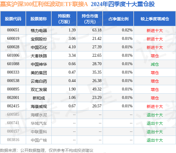 从基金规模来看,嘉实沪深300红利低波动ETF联接A基金2024年四季度公布的基金规模为18.3亿元,较上一期规模13.56亿元变化了4.74亿元,环比变化了34.98%。该基金最新一期资产配置为:股票占净值比0.21%,无债券类资产,现金占净值比6.47%。从基金持仓来看,该基金当季前十大股票仓位达0.11%,第一大重仓股为格力电器(000651),持仓占比为0.02%。