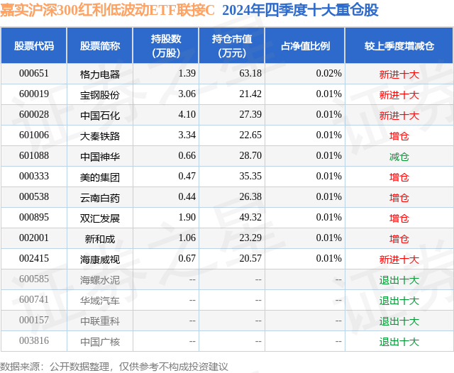 从基金规模来看,嘉实沪深300红利低波动ETF联接C基金2024年四季度公布的基金规模为14.79亿元,较上一期规模11.6亿元变化了3.19亿元,环比变化了27.46%。该基金最新一期资产配置为:股票占净值比0.21%,无债券类资产,现金占净值比6.47%。从基金持仓来看,该基金当季前十大股票仓位达0.11%,第一大重仓股为格力电器(000651),持仓占比为0.02%。