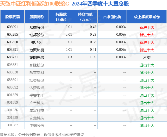 从基金规模来看,天弘中证红利低波动100联接C基金2024年四季度公布的基金规模为23.27亿元,较上一期规模18.77亿元变化了4.5亿元,环比变化了23.98%。该基金最新一期资产配置为:无股票类资产,无债券类资产,现金占净值比5.95%。从基金持仓来看,该基金当季前十大股票仓位达0.0%,第一大重仓股为众鑫股份(603091),持仓占比为0.0%。