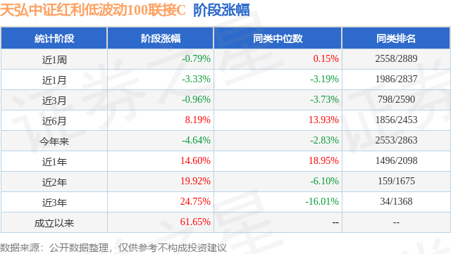 从业绩表现来看,天弘中证红利低波动100联接C基金过去一年净值涨幅为14.6%,在同类基金中排名1496/2098,同类基金过去一年净值涨幅中位数为18.95%。而基金过去一年的最大回撤为-13.26%,成立以来的最大回撤为-14.08%。