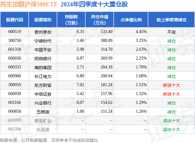 从基金规模来看,民生加银沪深300ETF基金2024年四季度公布的基金规模为1.2亿元,较上一期规模1.22亿元变化了-225.09万元,环比变化了-1.84%。该基金最新一期资产配置为:股票占净值比95.82%,无债券类资产,现金占净值比4.16%。从基金持仓来看,该基金当季前十大股票仓位达21.34%,第一大重仓股为贵州茅台(600519),持仓占比为4.45%。