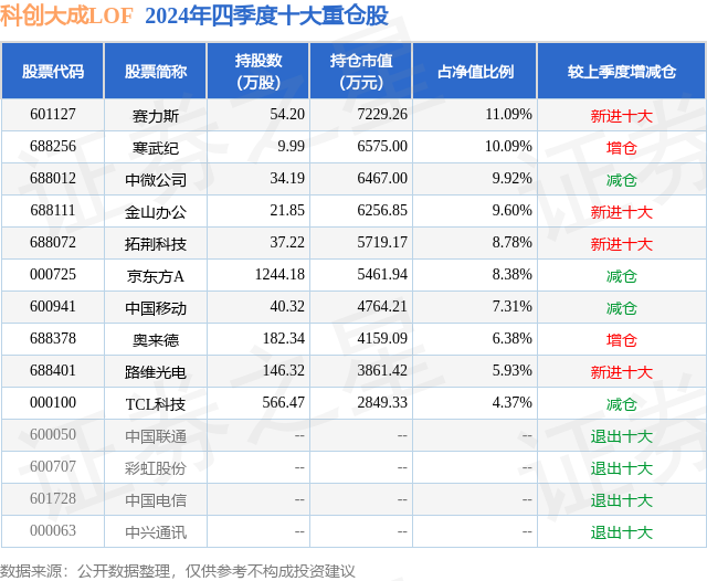 从基金规模来看,科创大成LOF基金2024年四季度公布的基金规模为6.27亿元,较上一期规模7.23亿元变化了-9608.91万元,环比变化了-13.29%。该基金最新一期资产配置为:股票占净值比88.08%,无债券类资产,现金占净值比10.06%。从基金持仓来看,该基金当季前十大股票仓位达81.85%,第一大重仓股为赛力斯(601127),持仓占比为11.09%。