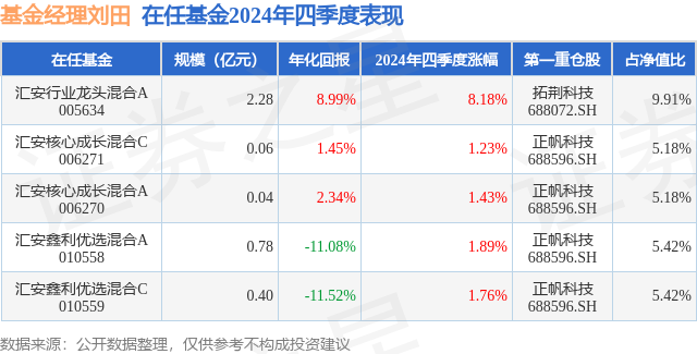 证券之星消息,日前汇安核心成长混合A基金公布四季报,2024年四季度最新规模0.04亿元,季度净值涨幅为1.43%。