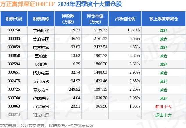 从基金规模来看,方正富邦深证100ETF基金2024年四季度公布的基金规模为5.0亿元,较上一期规模5.5亿元变化了-5091.67万元,环比变化了-9.25%。该基金最新一期资产配置为:股票占净值比98.96%,无债券类资产,现金占净值比1.18%。从基金持仓来看,该基金当季前十大股票仓位达40.13%,第一大重仓股为宁德时代(300750),持仓占比为10.29%。