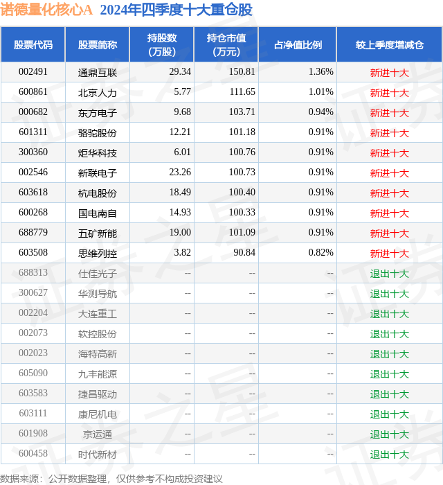 从基金规模来看,诺德量化核心A基金2024年四季度公布的基金规模为0.79亿元,较上一期规模7401.79万元变化了502.59万元,环比变化了6.79%。该基金最新一期资产配置为:股票占净值比92.85%,无债券类资产,现金占净值比6.77%。从基金持仓来看,该基金当季前十大股票仓位达9.59%,第一大重仓股为通鼎互联(002491),持仓占比为1.36%。
