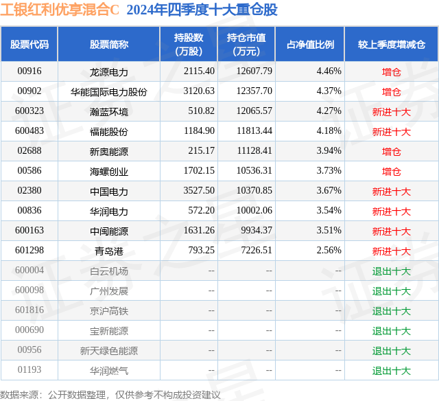 从基金规模来看,工银红利优享混合C基金2024年四季度公布的基金规模为4.2亿元,较上一期规模7.29亿元变化了-3.08亿元,环比变化了-42.32%。该基金最新一期资产配置为:股票占净值比93.16%,债券占净值比5.02%,现金占净值比4.24%。从基金持仓来看,该基金当季前十大股票仓位达38.23%,第一大重仓股为龙源电力(00916),持仓占比为4.46%。