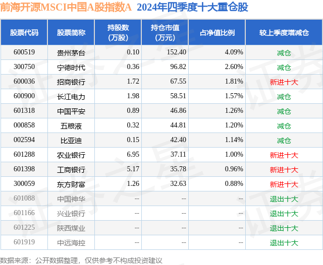 从基金规模来看,前海开源MSCI中国A股指数A基金2024年四季度公布的基金规模为0.13亿元,较上一期规模1424.82万元变化了-174.04万元,环比变化了-12.22%。该基金最新一期资产配置为:股票占净值比92.31%,债券占净值比4.62%,现金占净值比2.86%。从基金持仓来看,该基金当季前十大股票仓位达16.51%,第一大重仓股为贵州茅台(600519),持仓占比为4.09%。