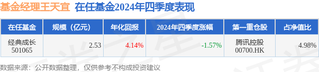 证券之星消息,日前经典成长基金公布四季报,2024年四季度最新规模2.53亿元,季度净值涨幅为-1.57%。
