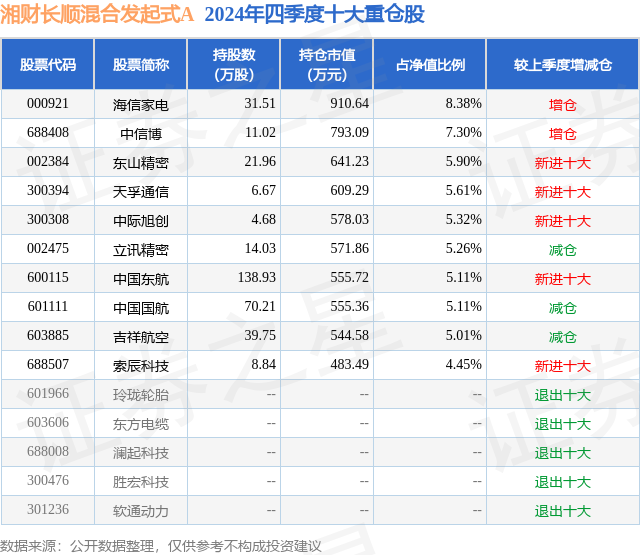 证券之星消息,日前湘财长顺混合发起式A基金公布四季报,2024年四季度最新规模0.7亿元,季度净值涨幅为3.75%。