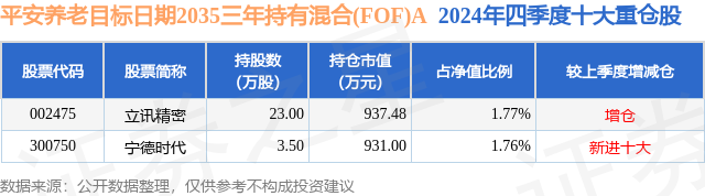 从基金规模来看,平安养老目标日期2035三年持有混合(FOF)A基金2024年四季度公布的基金规模为3.44亿元,较上一期规模3.89亿元变化了-4578.67万元,环比变化了-11.76%。该基金最新一期资产配置为:股票占净值比3.53%,无债券类资产,现金占净值比10.67%。从基金持仓来看,该基金当季前十大股票仓位达3.53%,第一大重仓股为立讯精密(002475),持仓占比为1.77%。