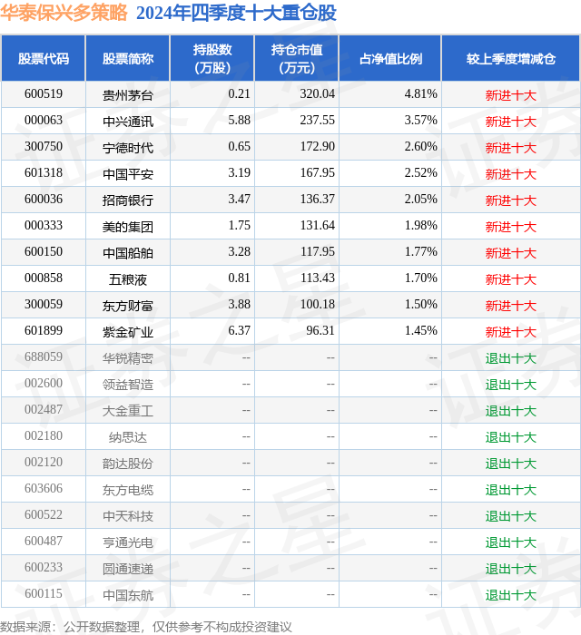 从基金规模来看,华泰保兴多策略基金2024年四季度公布的基金规模为0.67亿元,较上一期规模6792.87万元变化了-132.5万元,环比变化了-1.95%。该基金最新一期资产配置为:股票占净值比97.74%,无债券类资产,现金占净值比3.75%。从基金持仓来看,该基金当季前十大股票仓位达23.95%,第一大重仓股为贵州茅台(600519),持仓占比为4.81%。