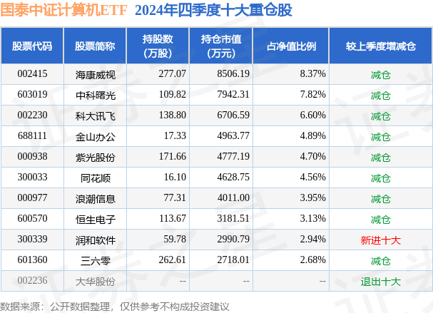 从基金规模来看,国泰中证计算机ETF基金2024年四季度公布的基金规模为10.16亿元,较上一期规模12.65亿元变化了-2.5亿元,环比变化了-19.72%。该基金最新一期资产配置为:股票占净值比99.49%,无债券类资产,现金占净值比0.64%。从基金持仓来看,该基金当季前十大股票仓位达49.64%,第一大重仓股为海康威视(002415),持仓占比为8.37%。