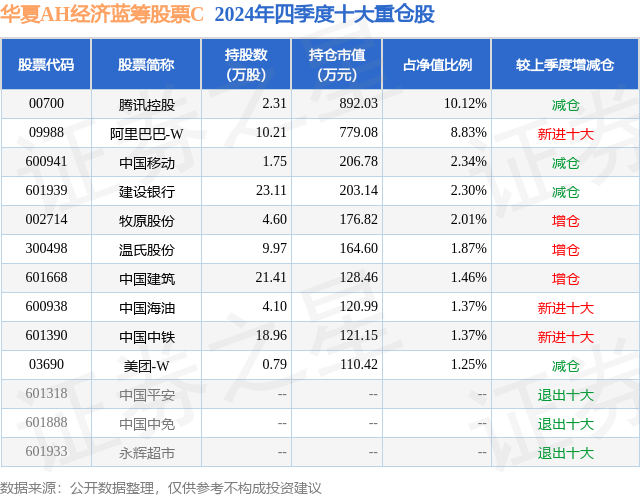 从基金规模来看,华夏AH经济蓝筹股票C基金2024年四季度公布的基金规模为0.5亿元,较上一期规模5287.51万元变化了-303.63万元,环比变化了-5.74%。该基金最新一期资产配置为:股票占净值比93.94%,无债券类资产,现金占净值比6.67%。从基金持仓来看,该基金当季前十大股票仓位达32.92%,第一大重仓股为腾讯控股(00700),持仓占比为10.12%。